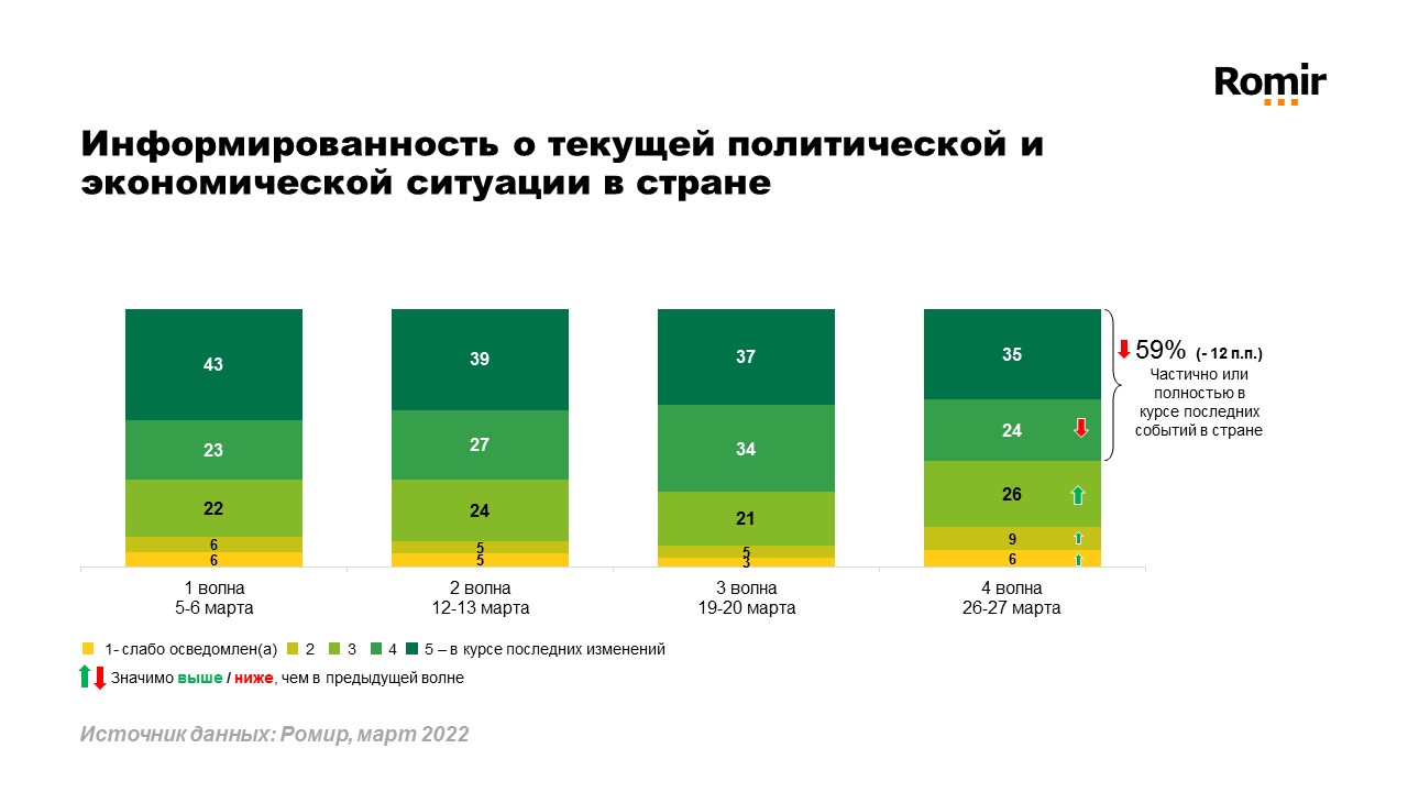 К концу марта на 12 процентных пунктов снизилась общая оценка собственной информированности россиян – 59% считают, что в курсе текущей ситуации в стране. Доля полностью уверенных в своей информированности изменилась незначительно. Показатель снизился за счет группы частично осведомленных. Также значимо растёт доля людей, которые считают себя в курсе ситуации в меньшей степени.