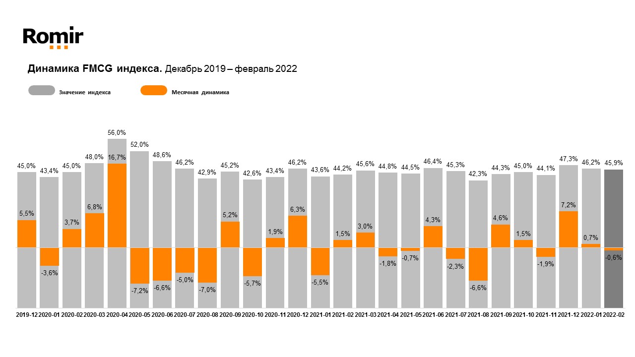 В феврале на FMCG-товары пришлось 45,9% расходов россиян. Это на 0,7% меньше, чем в январе. Затраты россиян в конце февраля выросли как на товары повседневного спроса, так и на остальные категории, включая технику, поэтому доля FMCG незначительно изменилась по сравнению с январем.