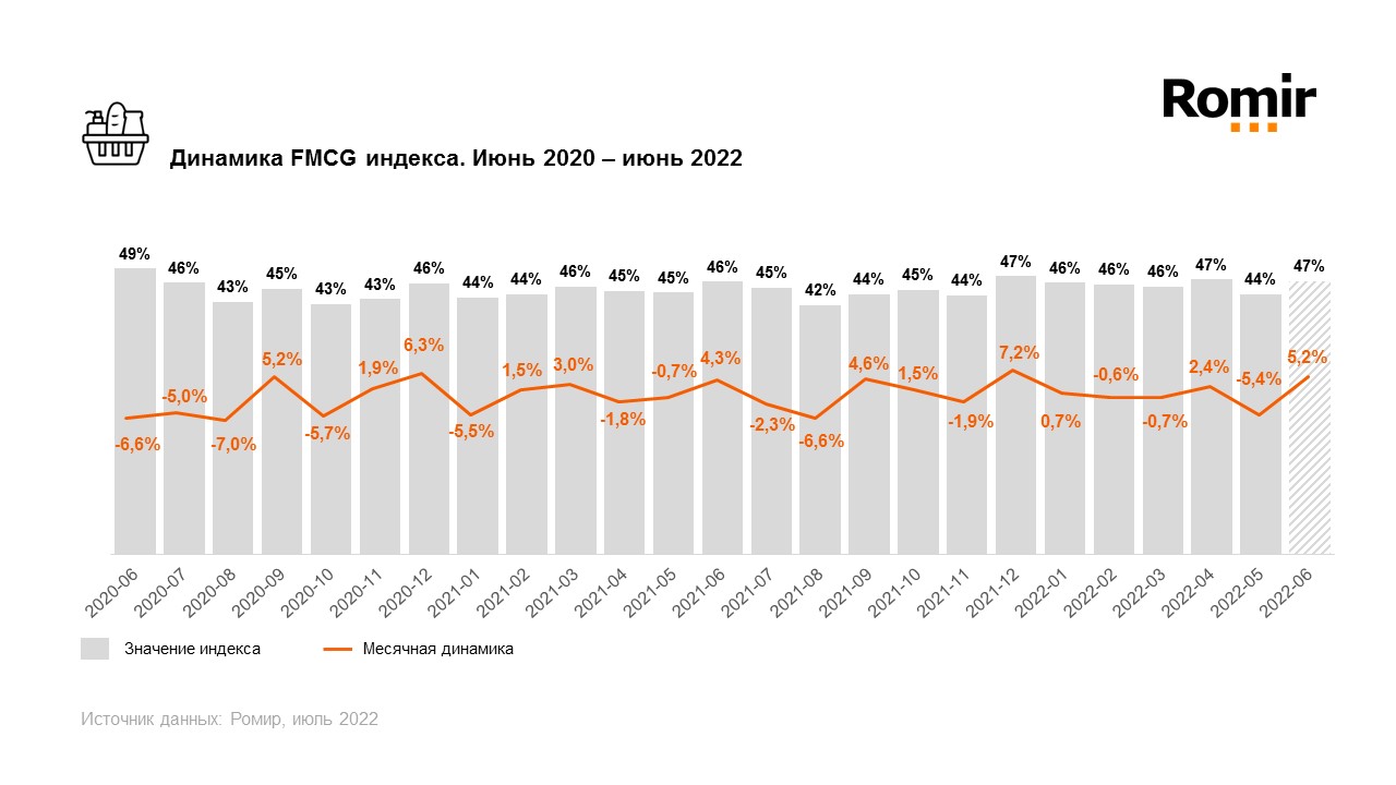 В июне на FMCG-товары пришлось 47% расходов россиян. Это на 5,2% больше, чем в мае. По сравнению с аналогичным периодом прошлого года индекс выше на 0,2%.