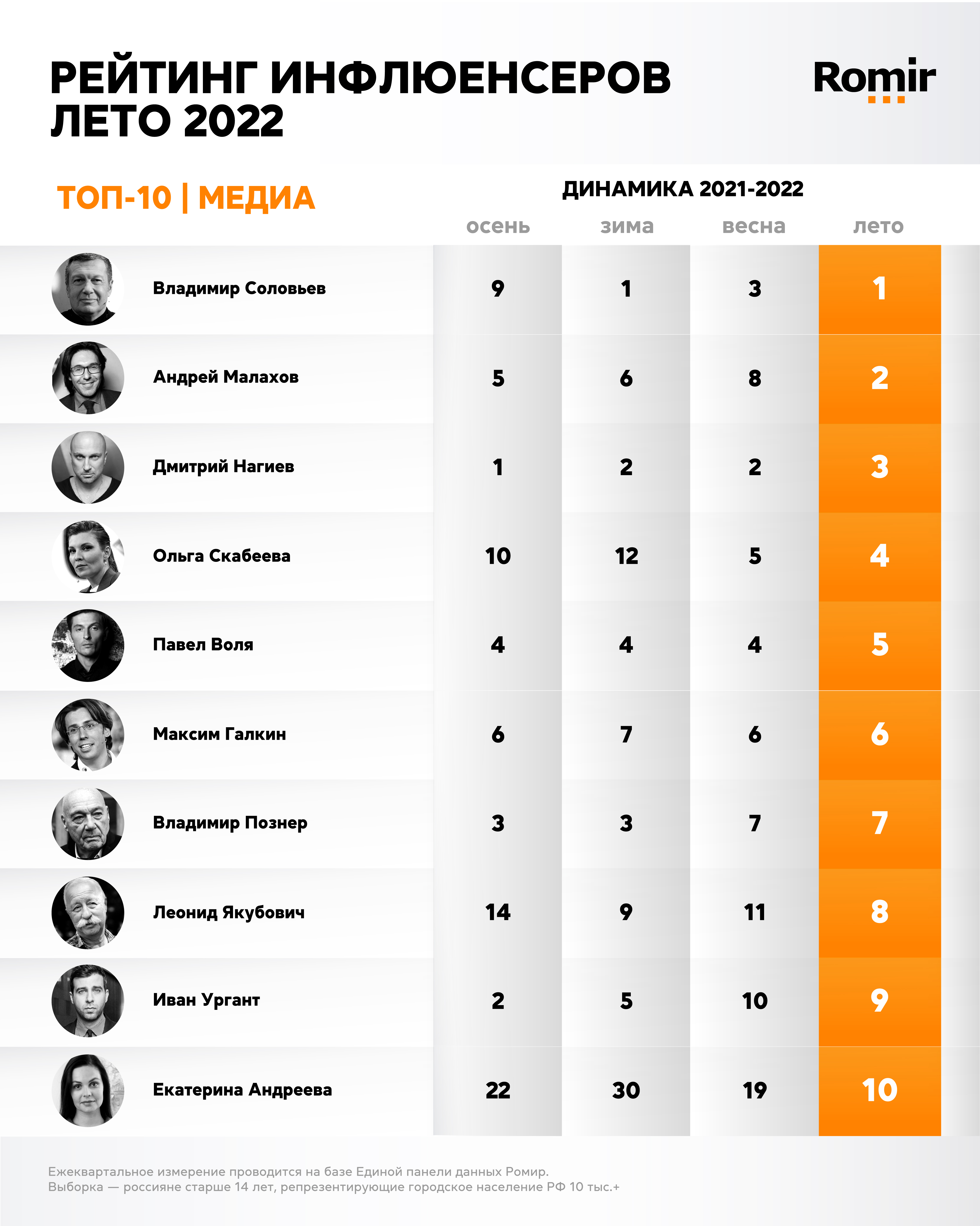 Исследовательский холдинг Ромир в рамках ежеквартального рейтинга инфлюенсеров представляет топ-10 лидеров мнений россиян в категории «Медиа».