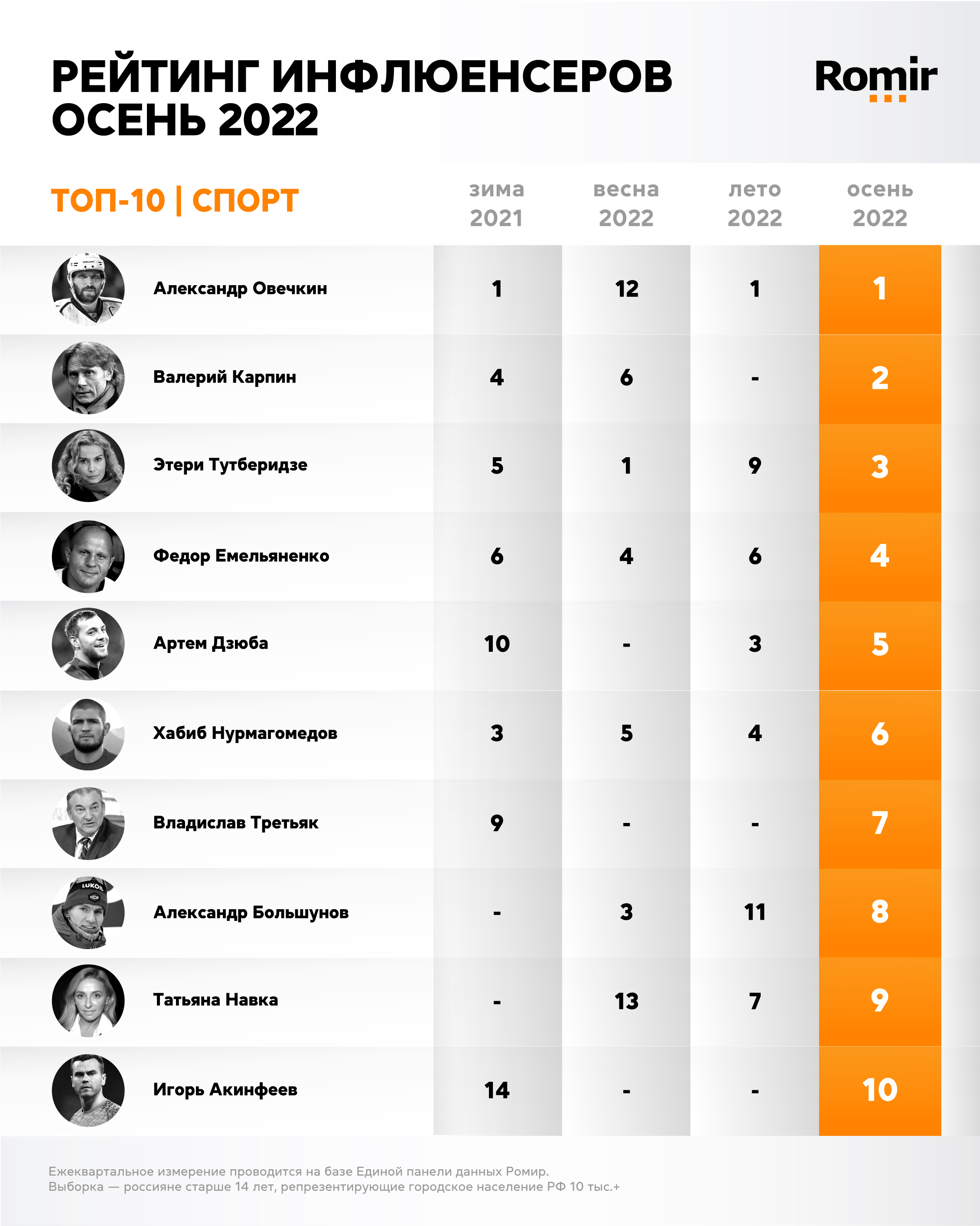 На 6 место поднялся боец Хабиб Нурмугамедов. Вернулся в список инфлюенсеров среди спортсменов и занял 7 место президент Федерации хоккея России Владислав Третьяк. На 8 место с 11 поднялся лыжник Александр Большунов. Фигуристка Татьяна Навка заняла 9 место в осеннем рейтинге. Замыкает десятку лидеров футболист Игорь Акинфеев.