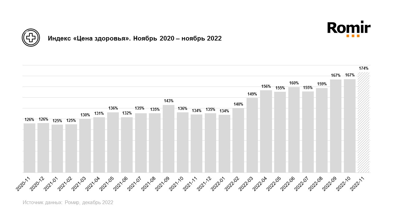 В ноябре цены на лекарства увеличились лишь на 3,9% (7 п.п.) за месяц. Индекс «Цена здоровья» в ноябре составил 174%. В годовой динамике индекс вырос на 29,4%.