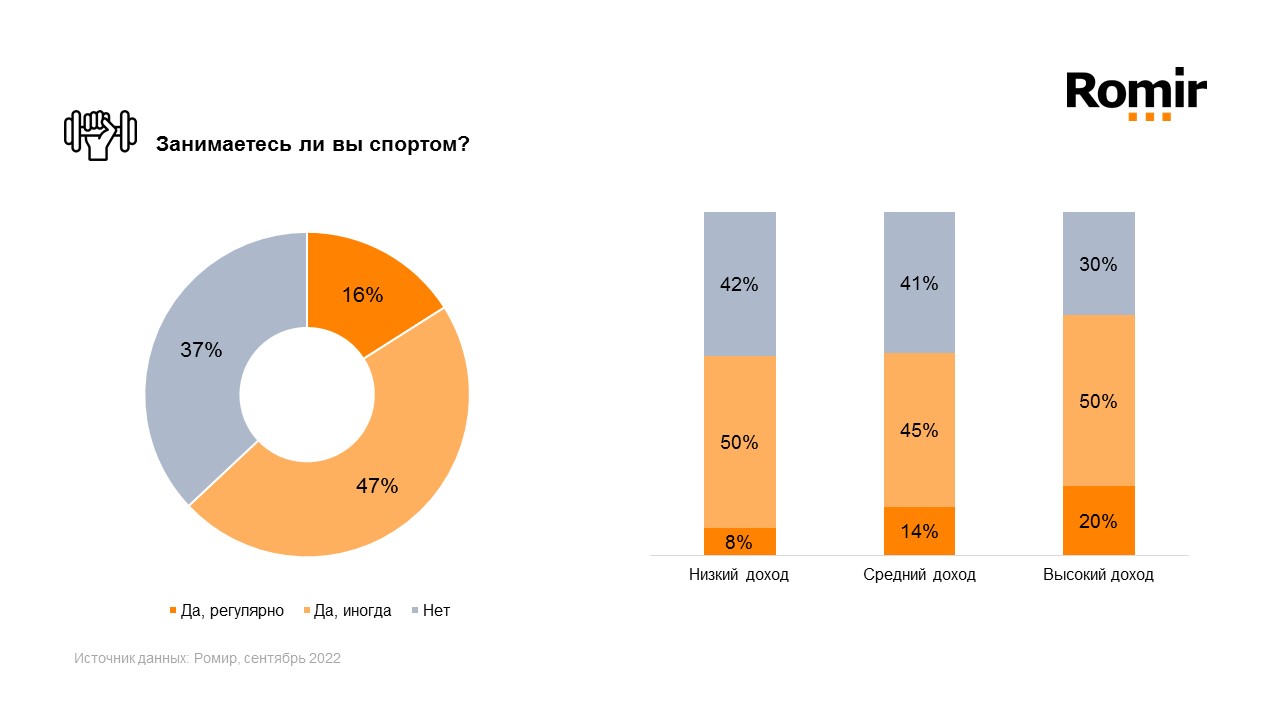 По данным исследования Ромир, в целом 63% россиян занимаются спортом. При этом мужчины чаще проводят регулярные тренировки, чем женщины – 18% vs 14%. Всего среди россиян регулярные тренировки проводят 16%, а 47% отметили, что занимаются спортом лишь иногда.
