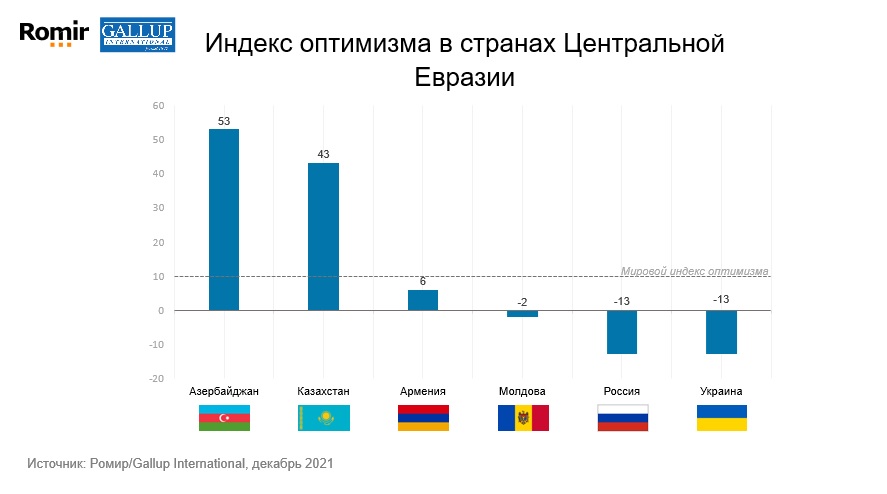 По индексу оптимизма Gallup Hope Index (ответы «лучше» минус ответы «хуже») вошел в топ-5 мировых оптимистов и лидирует среди постсоветских стран Азербайджан (+53). За ним следует Казахстан с индексом +43. Положительный индекс оптимизма у жителей Армении (+6). Мировой индекс оптимизма к концу 2021 составил +10.