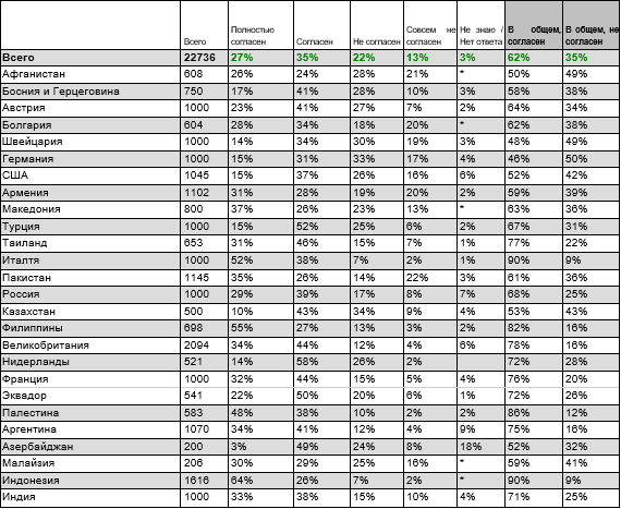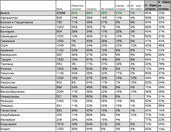 Снэп-опрос Gallup International был проведен в 22 странах мира. В каждой стране репрезентативная выборка мужчин и женщин была опрошена в течение последних двух недель либо в личной беседе, либо по телефону, либо через Интернет. Погрешность опроса составляет +3-5% при 95% доверительном уровне.