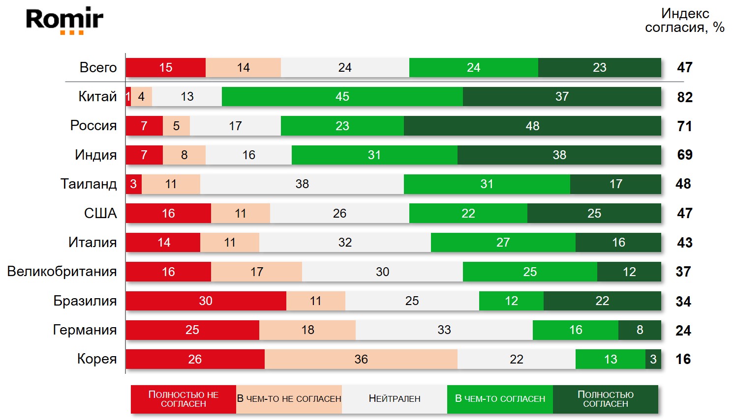 - Лидером среди стран по индексу согласия является Китай: подавляющее большинство респондентов (82%) выразили согласие с подобным мнением.