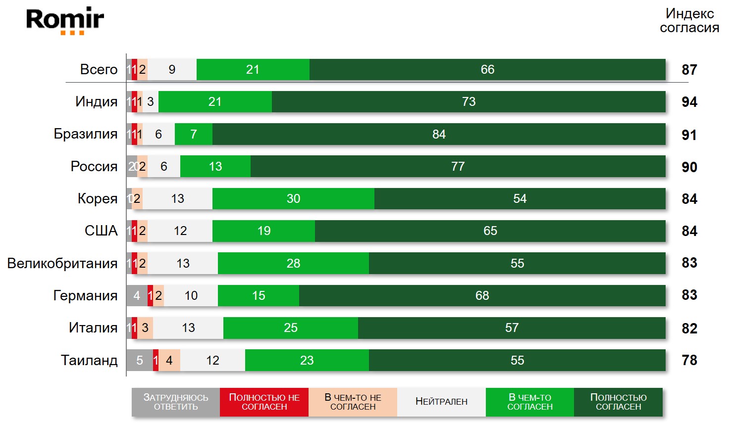 - Лидером среди стран по индексу согласия является Индия: подавляющее большинство респондентов (94%) выразили согласие с подобным мнением.