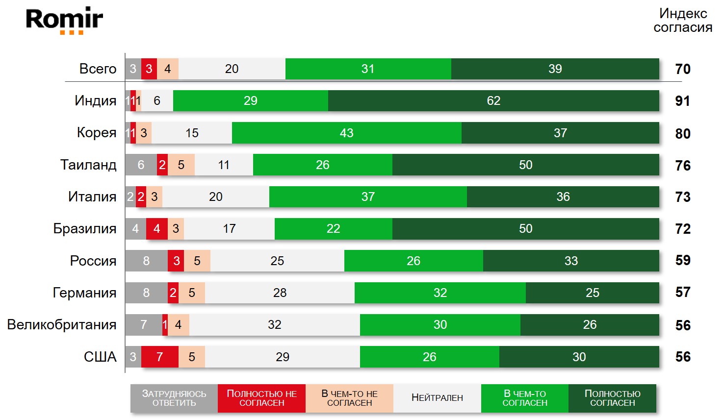 - Лидером среди стран по индексу согласия является Индия: подавляющее большинство респондентов (91%) выразили согласие с подобным мнением.