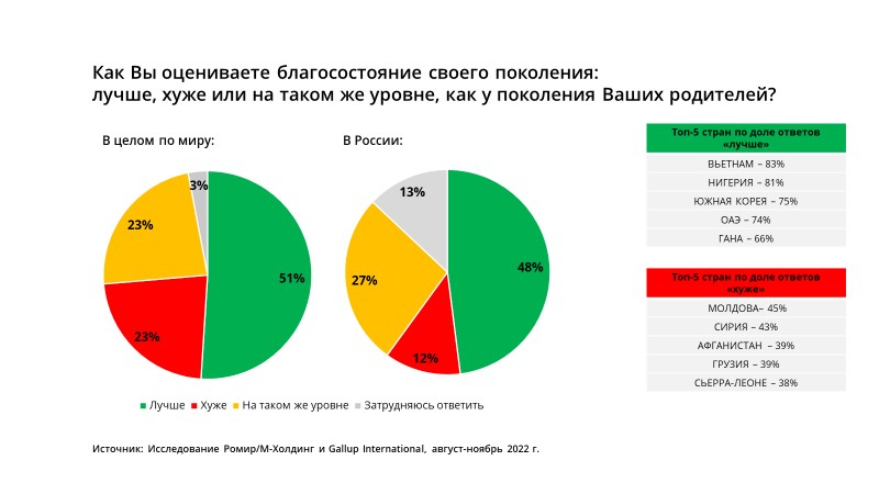 Эксперты компании «Ромир» (входит в группу исследовательских компаний «М-Холдинг») изучили, как жители 64 стран мира, включая Россию, оценивают свое благосостояние относительно прошлых и будущих поколений.