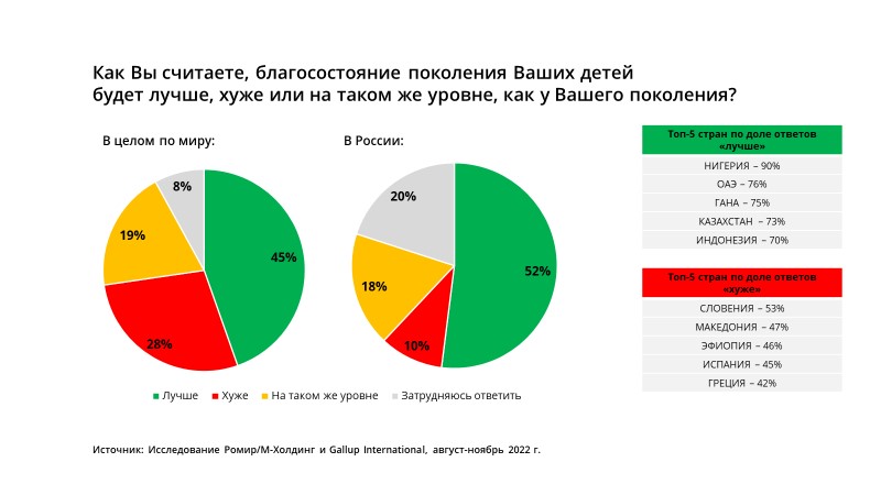Пессимистичнее всего на благополучие свои детей смотрят жители Словении (53% считают, что их жизнь будет хуже), Македонии (47%), Эфиопии (46%), Испании (45%) и Греции (42%).