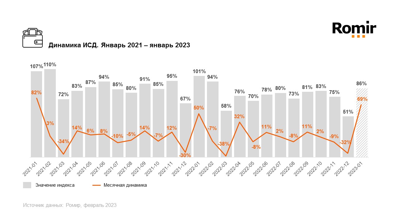 Индекс свободных денег составил 86%, что по сравнению с предшествующим месяцем вырос на 69% (35 п.п.). По отношению к январю 2022 года (ИСД – 101%) индекс ниже на 15% (15 п.п.).