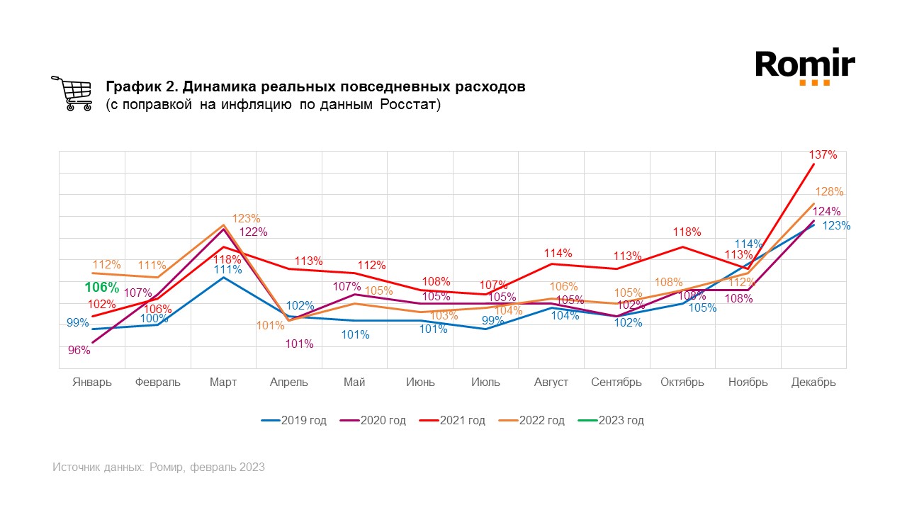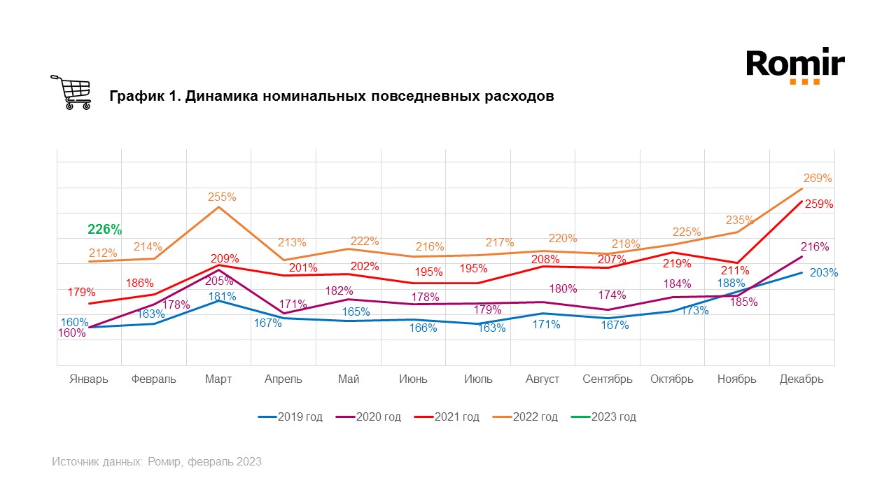 Согласно результатам исследования на базе Единой панели данных «Ромир»**, в январе 2023 года индекс повседневных номинальных (без поправки на инфляцию) расходов россиян составил 226%, что на 43 п.п. (16,0%) меньше, чем в декабре 2022-го. В годовой динамике индекс увеличился на 14 п.п. (6,6%).