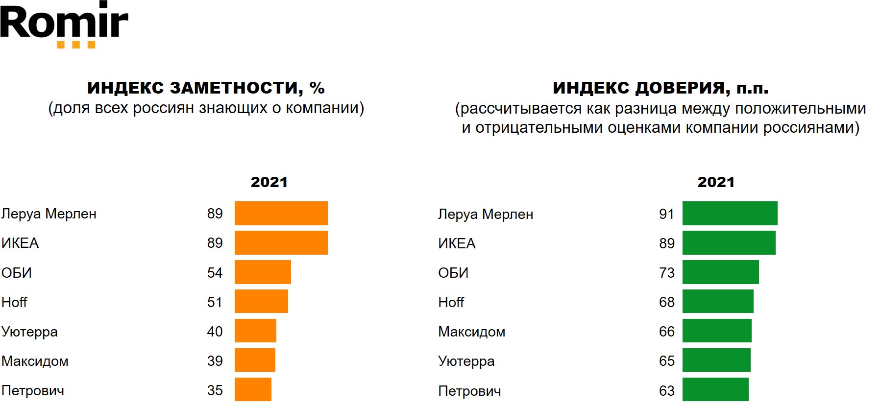 Тройка лидеров по индексу доверия повторяет индекс заметности: «Леруа Мерлен» (91 п.п.), «ИКЕА» (89 п.п.) и «ОБИ» (73 п.п.). Также позиции сохранили и Hoff (68 п.п.) и «Петрович» (63 п.п.). «Максидом» (66 п.п.) и «Уютерра» (65 п.п.) заняли пятое и шестое место соответственно.