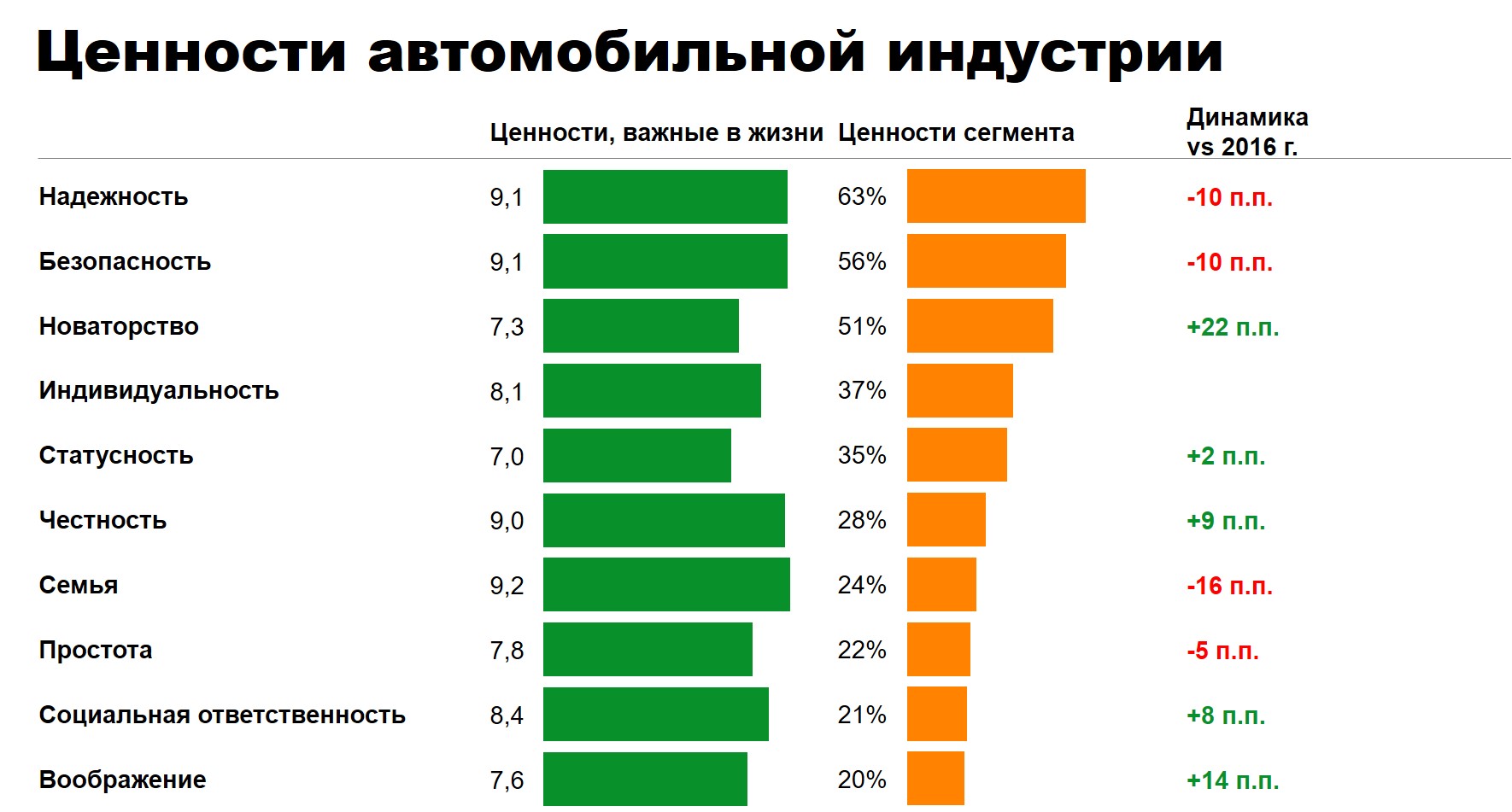 - Ключевые ценности слегка изменились: надежность и безопасность возглавляют рейтинг автомобильных брендов, как в 2016 году. На третью строчку в этом году поднялось новаторство, тогда как в 2016 году это место занимала семья.