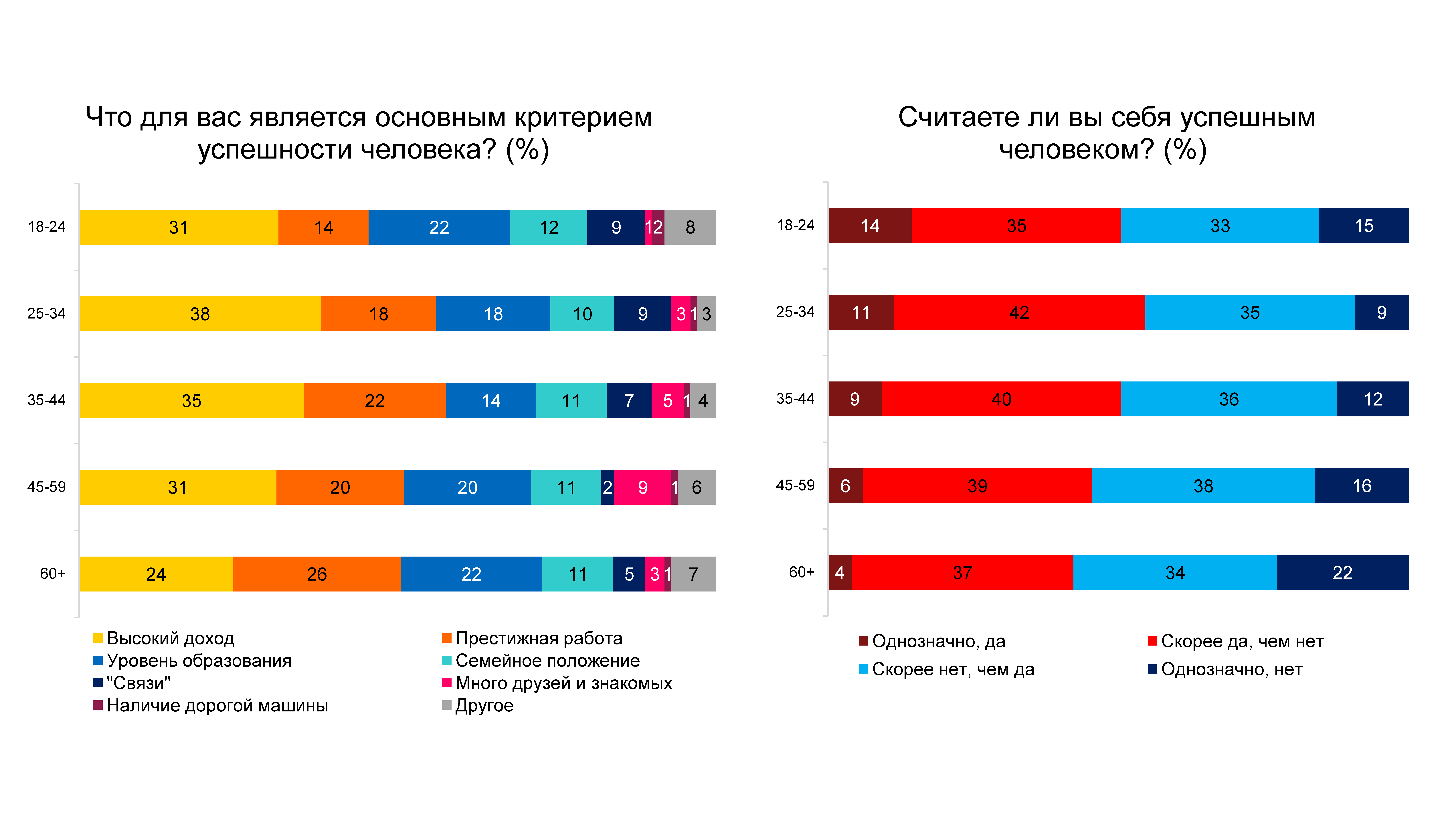 Говоря об успешности, люди в основном отталкиваются от следующих критериев: уровень дохода (32%), престижная работа (21%) и уровень образования (19%). По результатам исследования, больше всего на доход внимание обращают люди в возрасте от 25 до 34 лет (38%). В контексте успешности наименьшее значение доход имеет для людей старше 60 лет (24%).