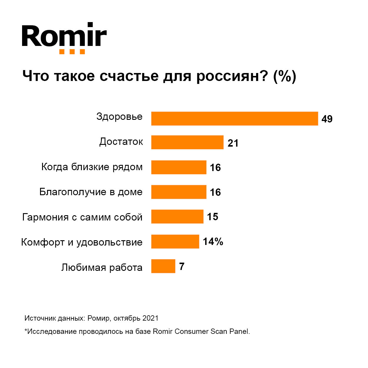 Исследовательский холдинг Ромир узнал мнение россиян о том, что для них является счастьем. Наиболее популярными вариантами ответа стали здоровье (49%) и достаток (21%).