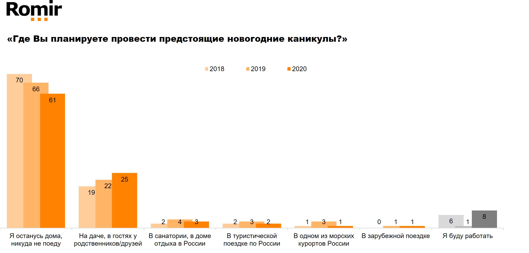 - Второй год подряд растет доля тех, кто планирует провести каникулы на даче, в гостях у родственников и друзей – 19% в 2018, 22% в 2019 и 25% в 2020 году. Напротив, сокращается доля россиян, которые на новогодних каникулах останется дома (с 70% в 2018 до 66% в 2019 и 61% в 2020 году). Кроме того, на 7% выросла доля тех, кто будет работать на каникулах.
