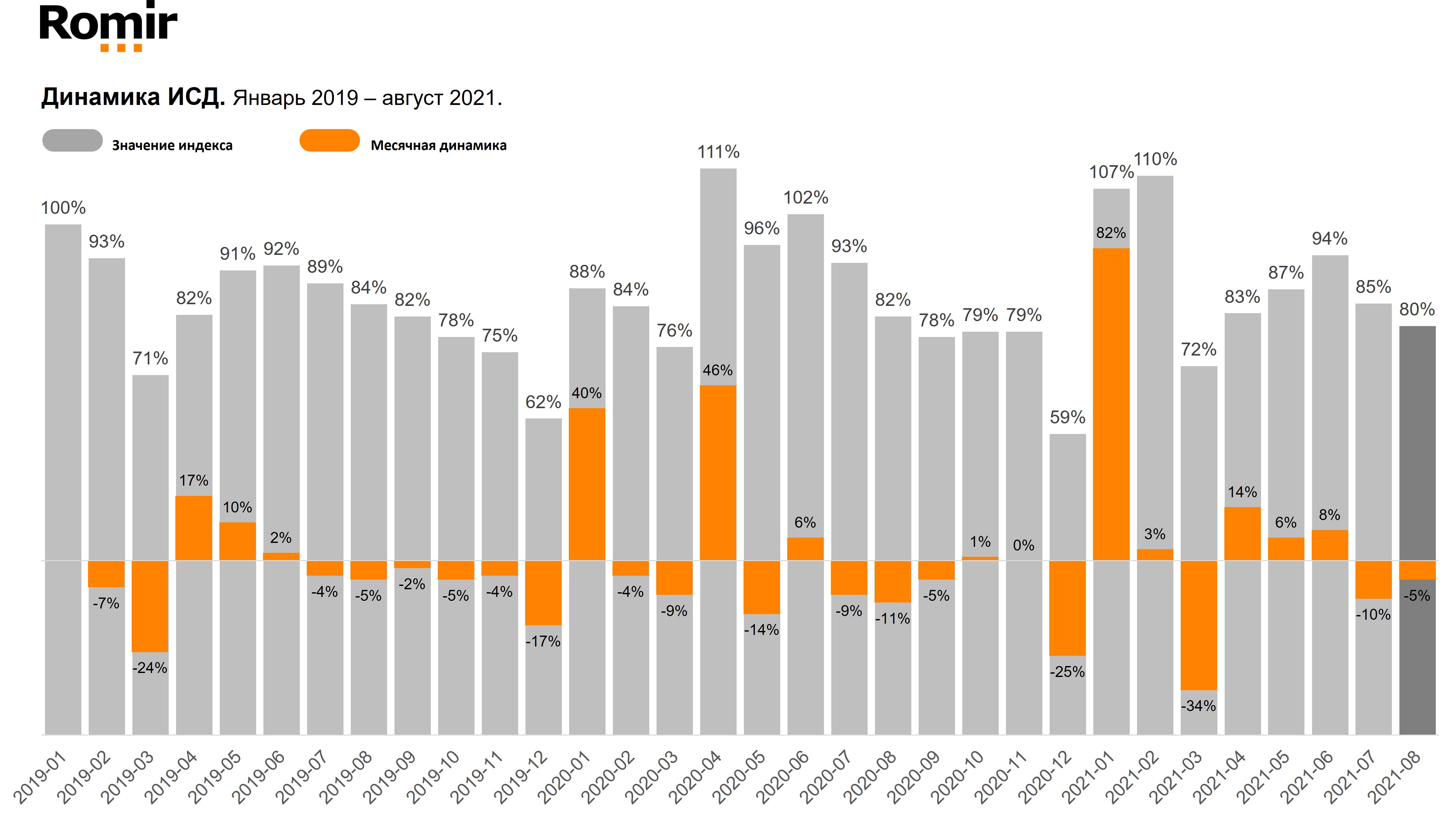 Согласно расчетам на основе данных Romir Scan Panel* о первоочередных затратах россиян и при сравнении их со средними доходами, в августе 2021 года объем «свободных денег» в среднестатистическом российском домохозяйстве сократился на 5% по сравнению с июлем 2021 года. Годовое же падение составило 2%. Показатель января 2019 года принят за 100% – исходную точку для расчета индекса. В августе 2021 года ИСД составил 80%.