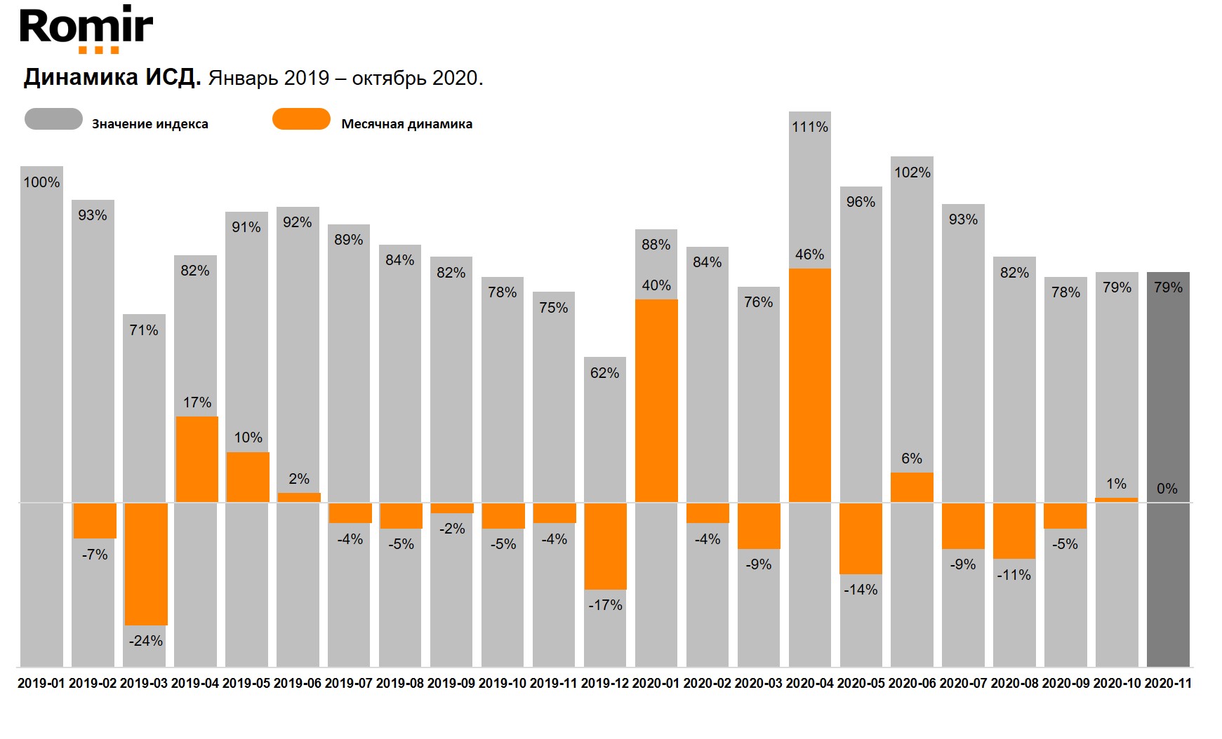 «Динамику индекса нельзя назвать негативной: в ноябре много распродаж (Черная пятница, 11.11, Киберпонедельник и др.) и траты возрастают. Аналогичную картину мы видели в прошлом ноябре, против которого 2020 год показывает рост. По итогам года ИСД, конечно, будет низким, но, тем не менее, мы можем надеяться, что в декабре мы снова увидим позитивную динамику против прошлого года», - комментирует результаты исследования исполнительный директор Mile Group Инна Караева.