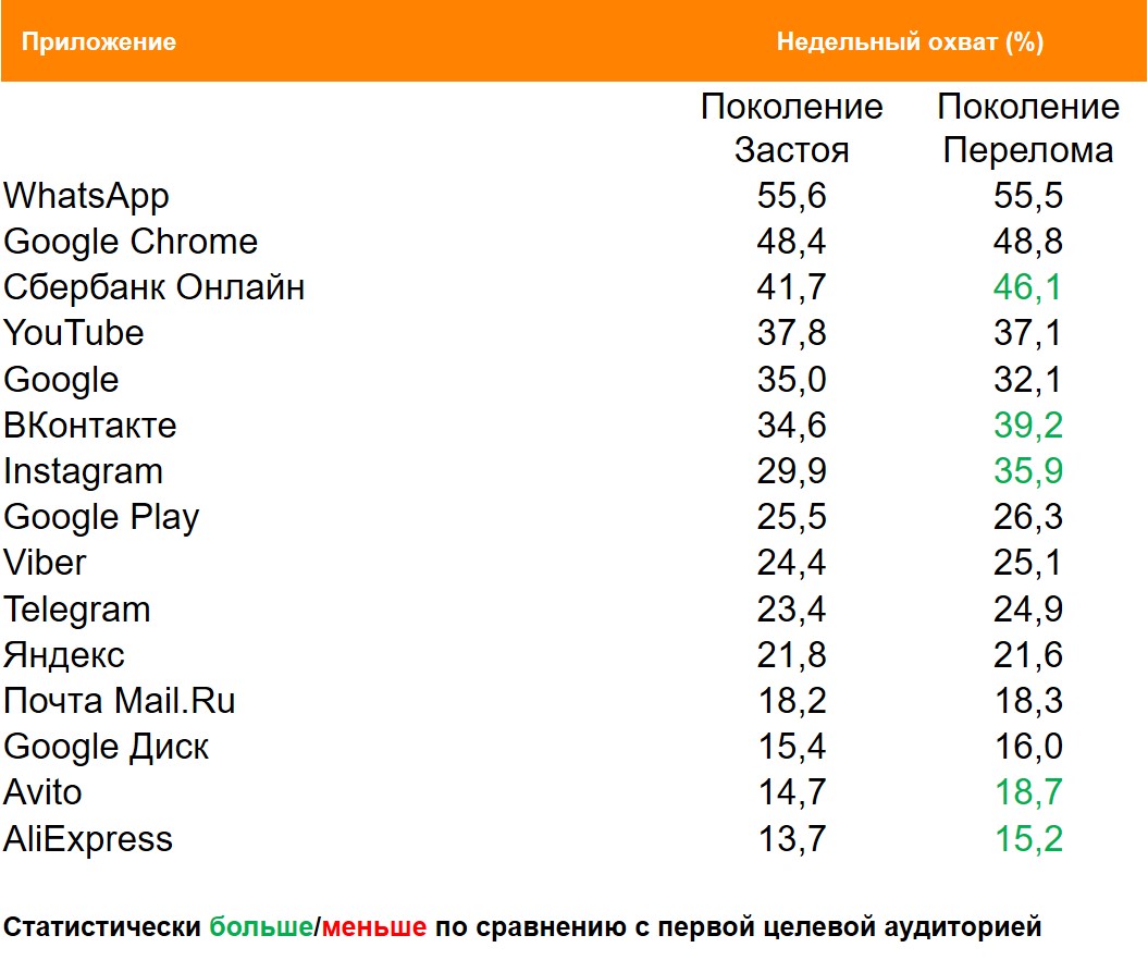 Поколение Перелома активнее поколения Заcтоя на прошлой неделе использовали приложения «Сбербанк Онлайн», Instagram, «ВКонтакте», Avito и AliExpress.