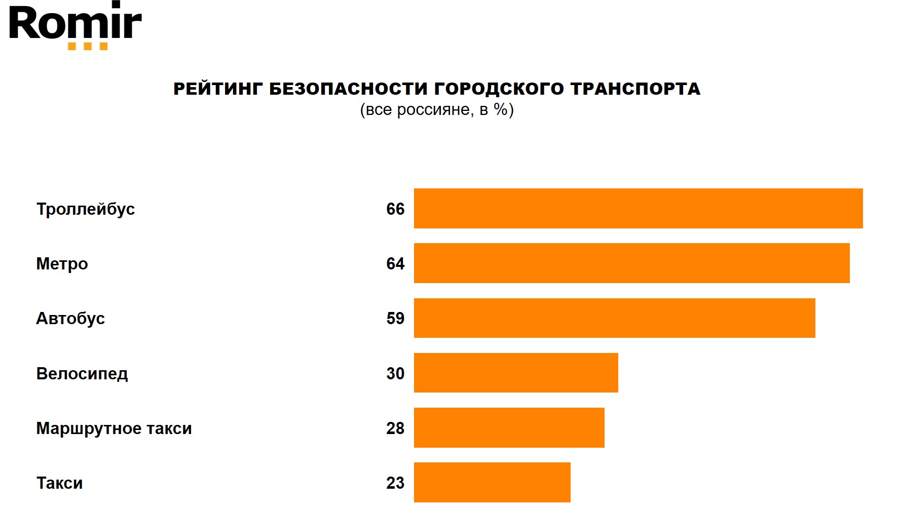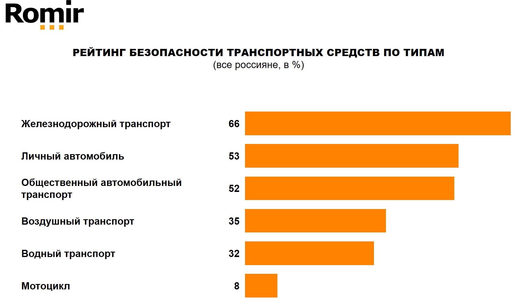 Наиболее безопасным средством передвижения, по мнению россиян, является железнодорожный транспорт (66%). Кроме того, доверием в этом вопросе у респондентов пользуются личные автомобили (53%) и общественный транспорт (52%). Меньше всего россиян (8%) назвали мотоцикл в качестве безопасного вида транспорта. Среди городского общественного транспорта наиболее безопасными, по мнению опрошенных, являются троллейбусы (66%), метро (64%) и автобусы (59%).