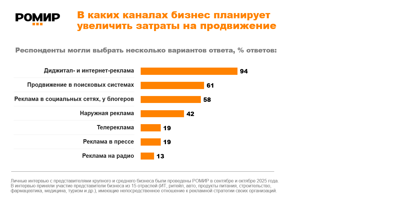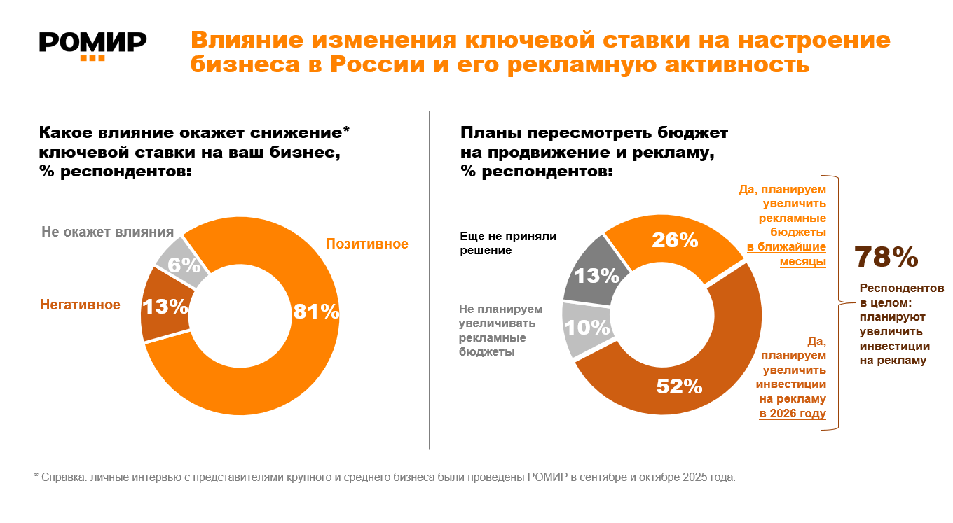 В сентябре — октябре 2025 года РОМИР провел исследование, посвященное влиянию снижения ключевой ставки на рекламную активность крупного и среднего бизнеса в России. В личных интервью приняли участие представители бизнеса из 15 отраслей (ИТ, ритейл, авто, продукты питания, строительство, фармацевтика, медицина, туризм и др.), имеющие непосредственное отношение к рекламной стратегии своих организаций.