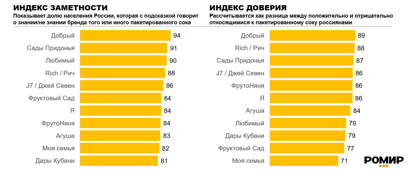 На основе международного индекса деловой репутации (GRI*) был составлен рейтинг марок. Безоговорочным лидером по двум ключевым показателям – узнаваемости и доверию – стал бренд «Добрый» (индекс заметности – 94, доверия – 89). Кроме того, лидирующие позиции занимают «Сады Придонья» (91 и 87 соответственно) и Rich (по 88 п.п.).