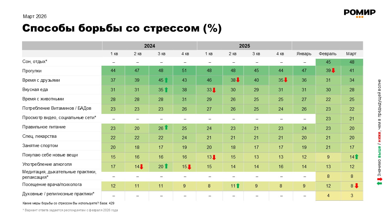 В марте 2026 года структура способов борьбы со стрессом остается стабильной. Данные РОМИР показывают, что россияне по-прежнему отдают предпочтение базовым и доступным сценариям восстановления.