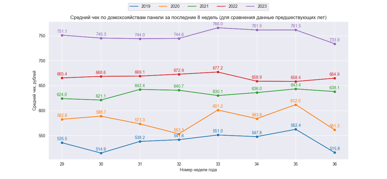 Средний чек на прошедшей 36 неделе 2023 года (с 4 сентября по 10 сентября) составил 733.88 руб., что на 3.63% меньше, чем неделей ранее. Средние недельные расходы домохозяйств составили 6148.9 руб. Индекс ИПА составил 210.4%, уменьшившись на 1.55% по отношению к предшествующей неделе.