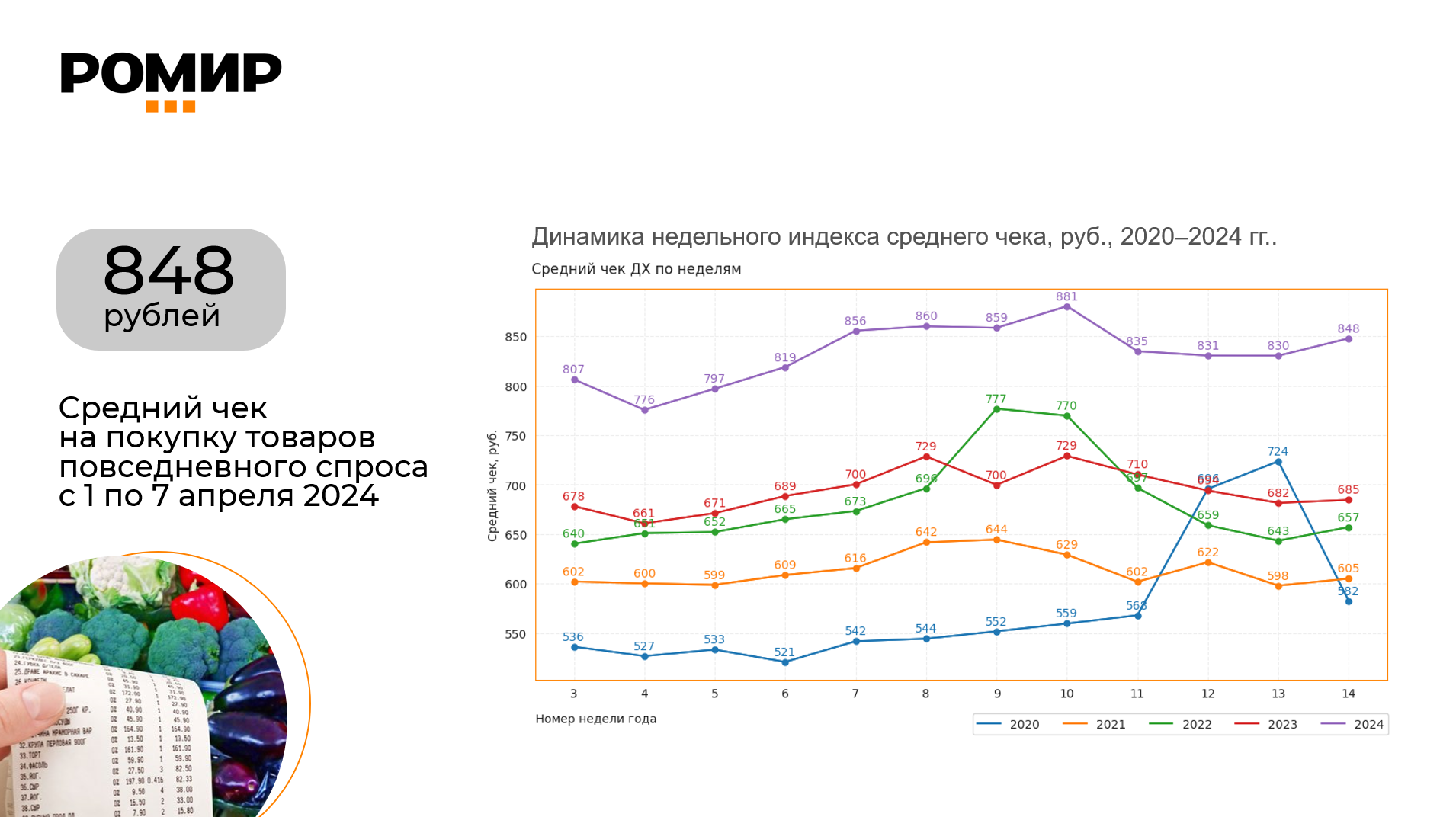 За прошедшую 14 неделю года (с 1 по 7 апреля) средний чек на покупку товаров повседневного спроса прибавил 18 руб. и достиг показателя в 848 руб., что на 2,2% больше, чем неделей ранее. По сравнению с аналогичной неделей прошлого года средний чек вырос на 163 руб. или на 23,8%.