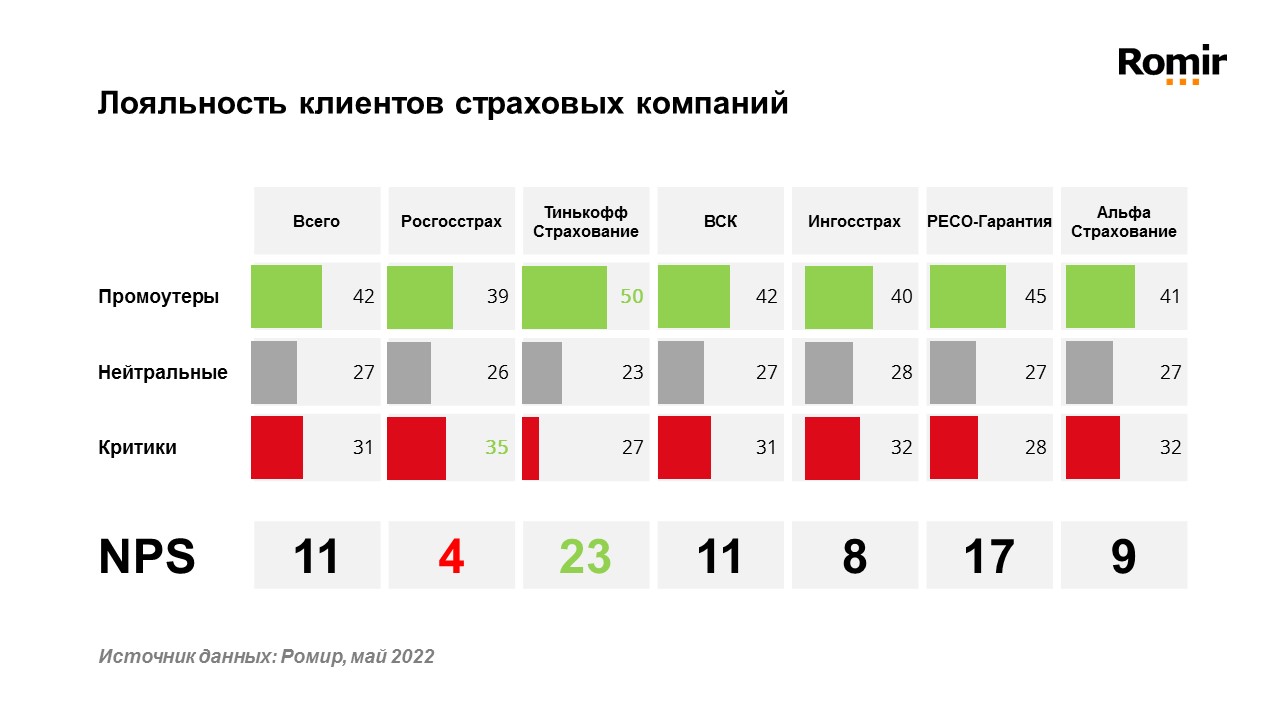 Ромир представляет данные по Индексу лояльности (NPS*) клиентов страховых компаний.