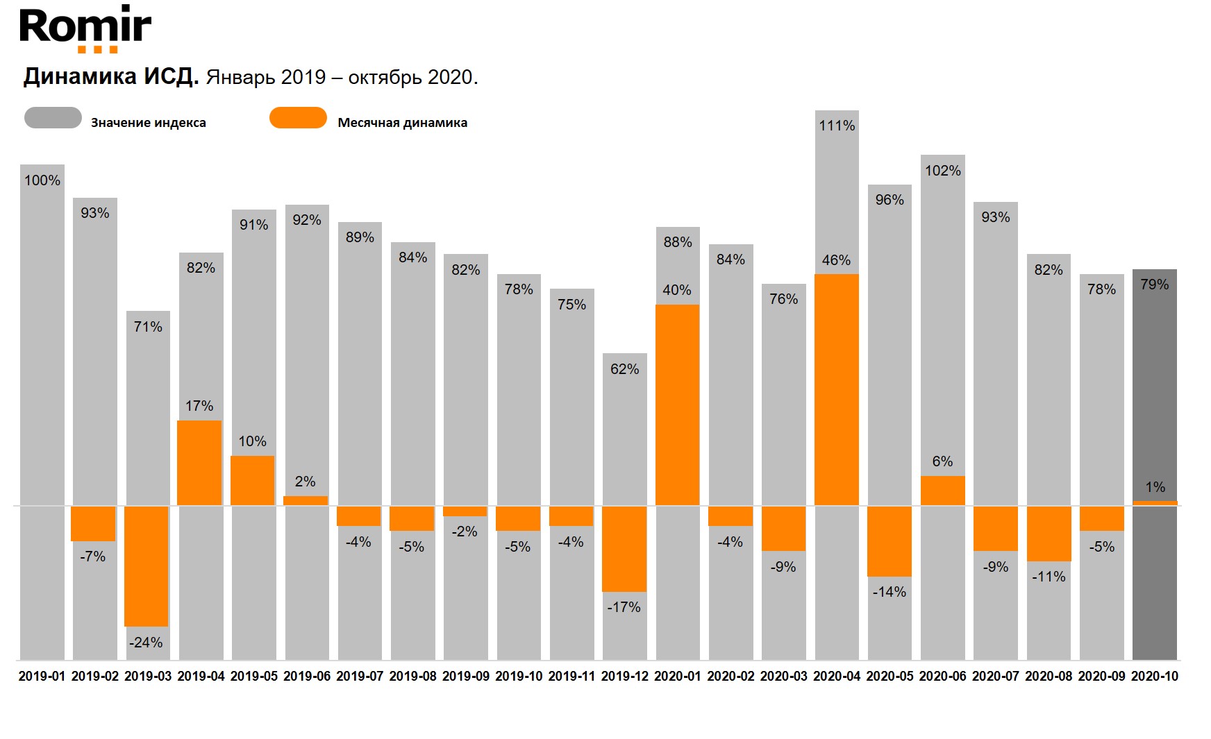 Согласно расчетам на основе данных Romir Scan Panel* о первоочередных затратах россиян и при сравнении их со средними доходами, в октябре объем «свободных денег» в среднестатистическом российском домохозяйстве вырос на 1% от уровня сентября (абсолютный рост на 1 п.п.), достигнув 79%. По сравнению с октябрем 2019 года индекс, несмотря резкое увеличение свободных денег в апреле и июне 2020 года, этот показатель также вырос на 1%.