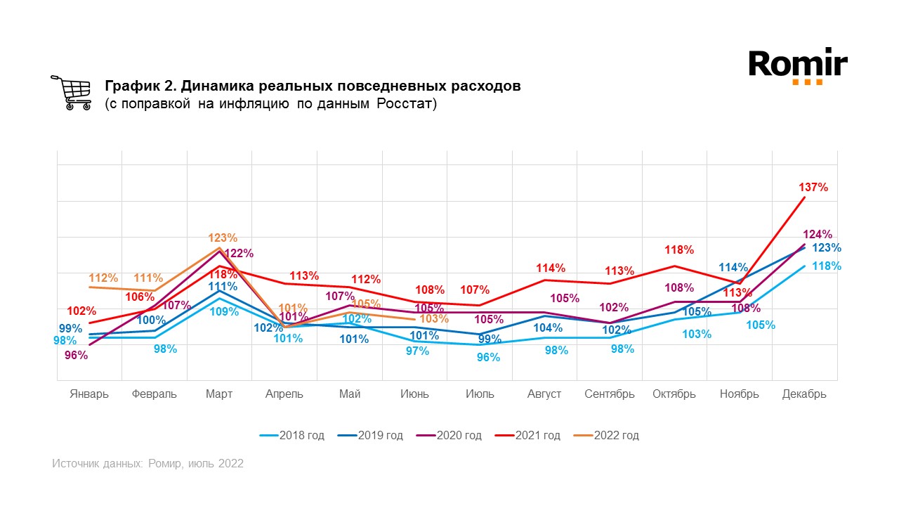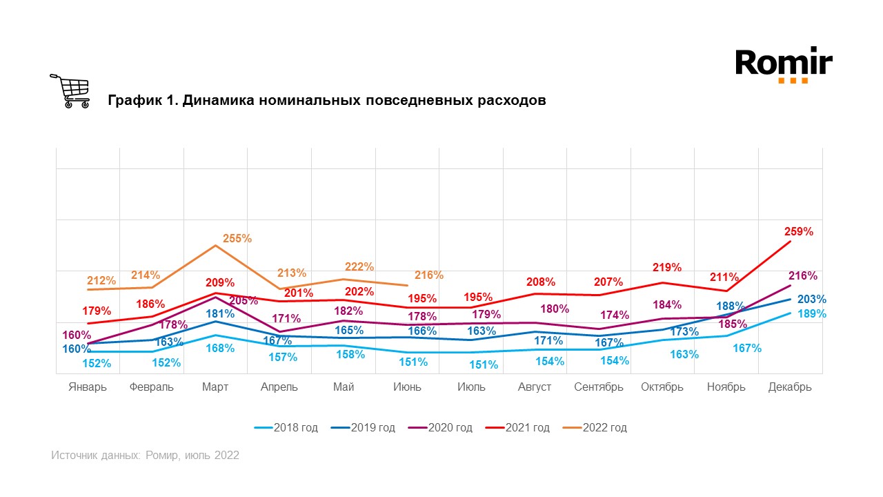 Согласно результатам исследования на базе Единой панели данных Ромир**, в июне 2022 года индекс повседневных номинальных (без поправки на инфляцию) расходов россиян составил 216%, что на 6 п.п. (2,7%) меньше, чем в мае. В годовой динамике индекс увеличился на 21 п.п. (10,8%).