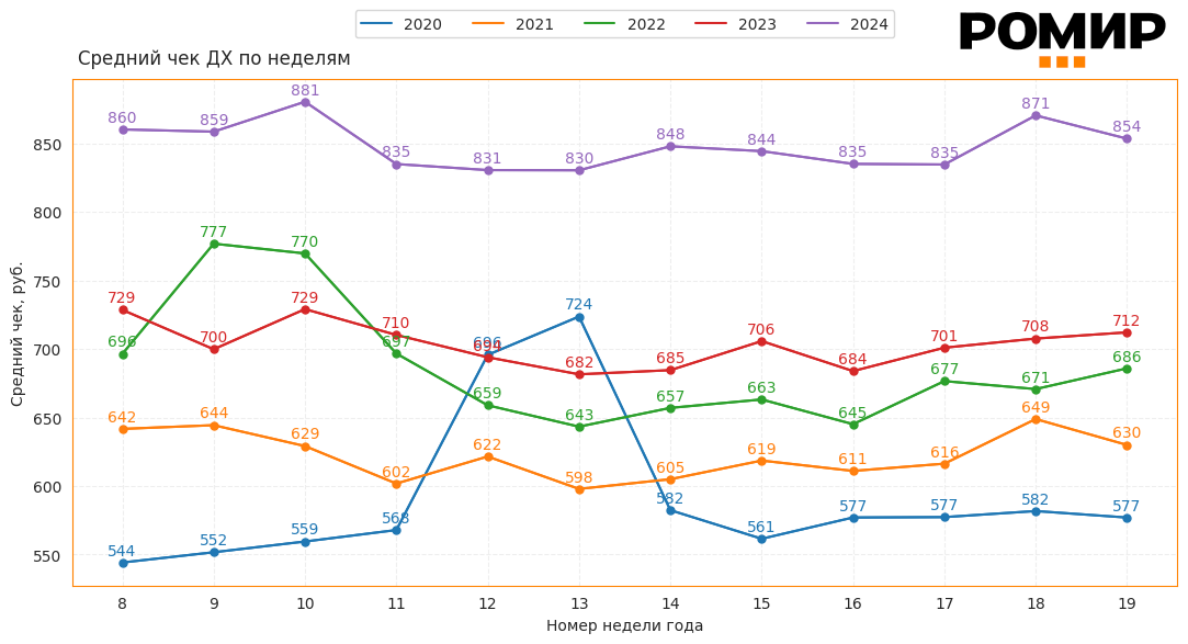 Диаграмма 1. Динамика недельного Индекса среднего чека, руб., 2020–2024 гг..