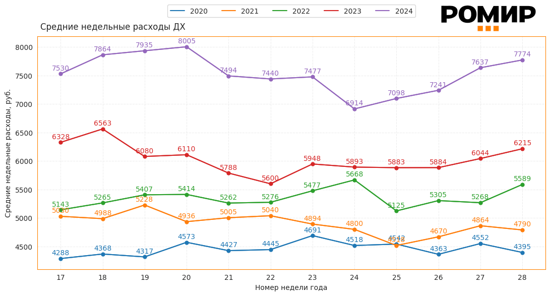 Также можно выделить еще один фактор, влияющий на рост недельных расходов в июле – увеличение расходов на детей и подростков. Летние каникулы — время, когда родители тратят больше средств на развлечения, образование и оздоровление детей.