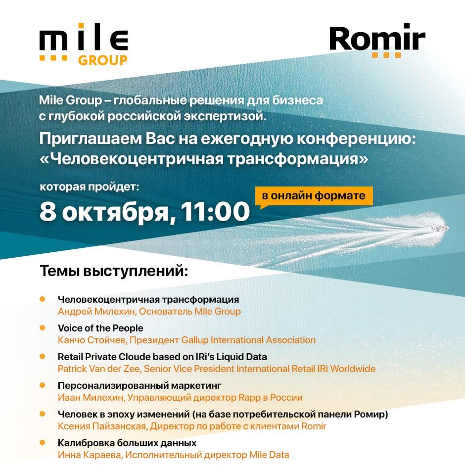 Клиентская конференция Mile Group «Человекоцентричная трансформация» в этот раз прошла в онлайн-формате. Участниками конференции стали представители компаний-лидеров фармацевтического, автомобильного, FMCG и других рынков (AB InBev, Coca-Cola, GlaxoSmithKline, Infiniti, МегаФон и др.).