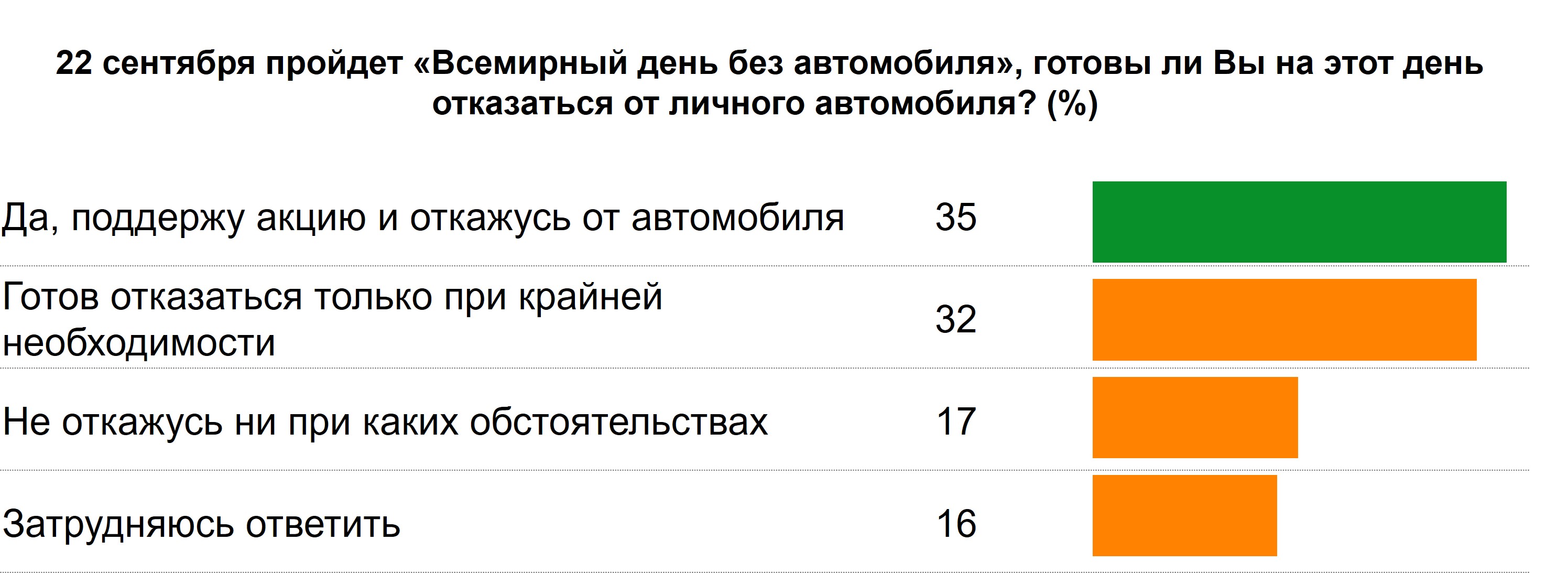 Из 1800 опрошенных респондентов более трети (35%) готовы поддержать акцию и отказаться от личного автомобиля на этот день. Еще 32% готовы это сделать лишь при крайней необходимости. 17% не готовы отказаться от личного авто ни при каких обстоятельствах.