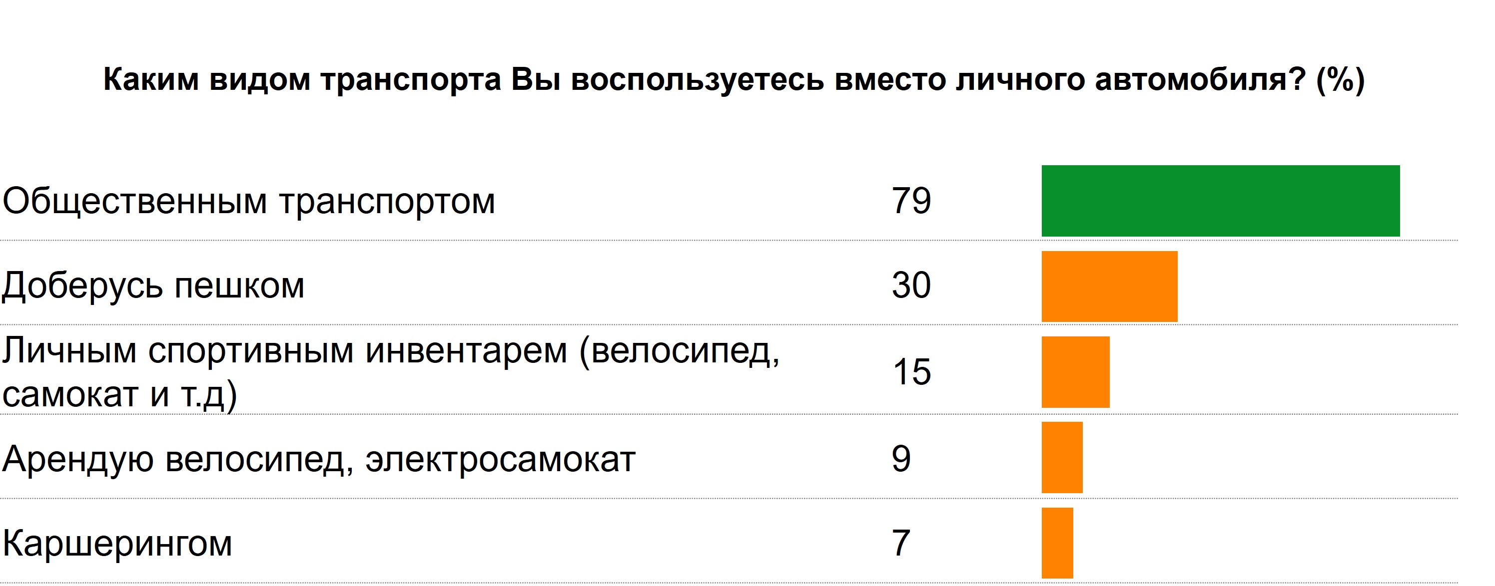 Наиболее популярной альтернативой личному транспорту стал общественный – им воспользуются 79% опрошенных в этот день. Почти треть респондентов (32%) готовы проделать часть или весь путь до нужного места пешком. Менее востребованные способы – это воспользоваться или арендовать велосипед, самокат. Несмотря на то, что часть опрошенных проведет день без личного автомобиля, они не готовы вовсе отказаться от этого вида транспортного средства и воспользуются каршерингом (7%).