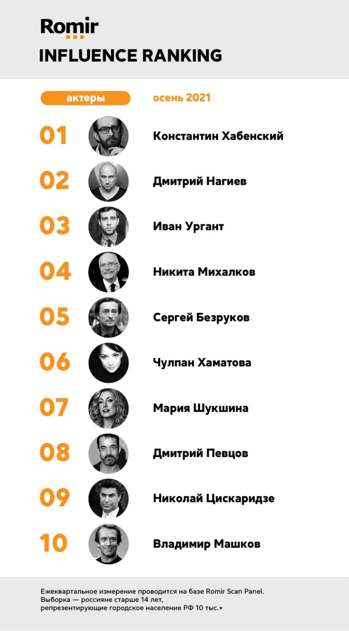 На первом месте – актер Константин Хабенский, который недавно был назначен художественным руководителем МХТ имени Чехова. На втором и третьем местах «пьедестала» – актеры, делающие успешную карьеру телеведущих, Дмитрий Нагиев и Иван Ургант. Отметим, что Хабенский, Нагиев и Ургант также являются лидерами общего рейтинга инфлюенсеров Ромир.