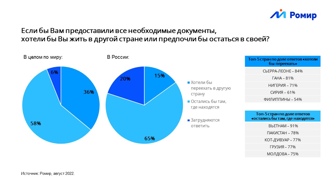 Лидерами по готовности эмигрировать стали жители Сьерра-Леоне (84%), Ганы (81%) и Нигерии (71%). Наименьшая готовность отмечена среди жителей Индии (4%), Вьетнама (8%), Японии (14%).
