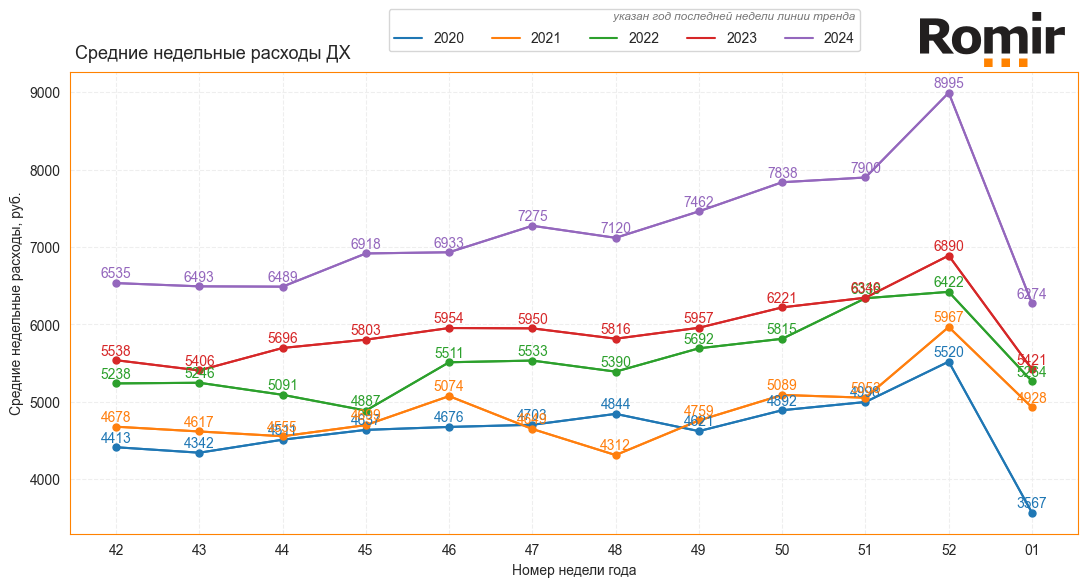 Диаграмма 1. Динамика Индекса недельных расходов, руб., 2020–2024 гг.