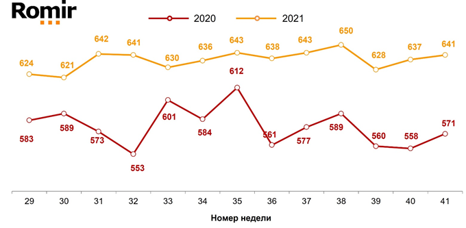 С 11 по 17 октября 2021 года средний чек (средняя стоимость одной покупки) россиянина составил 641 рубль: на 0,6% (4 рубля) выше, чем на прошлой неделе, и на 12,2% (70 рублей) выше, чем за этот же период в 2020 году.