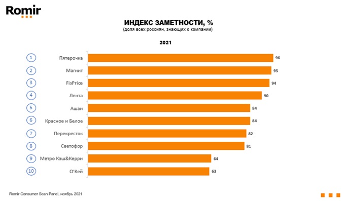 В этом году рейтинг заметности снова возглавили Пятерочка (знают эту компанию 96% респондентов), Магнит (95%) и FixPrice (94%). Также показали высокий результат и сохранили свои места в рейтинге Лента (90%), Ашан (84%) и Красное и Белое (84%).