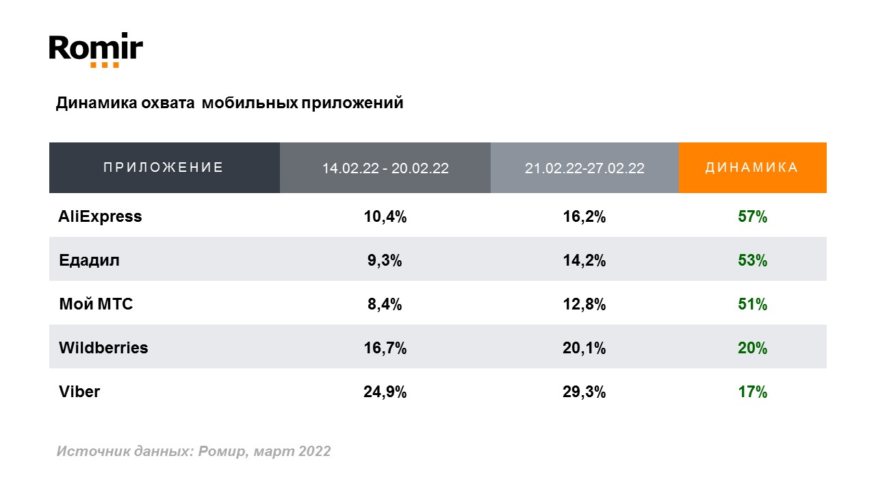 По данным Romir Single Source Panel с 21 по 27 февраля самую активную динамику охвата (57%) показало приложение AliExpress – с 10,4% охват увеличился до 16,2%. На втором месте «Едадил» – с 9,3% охват вырос до 14,2% (53%). Третьим по недельной динамике следует «Мой МТС» с ростом аудитории в два раза (51%).