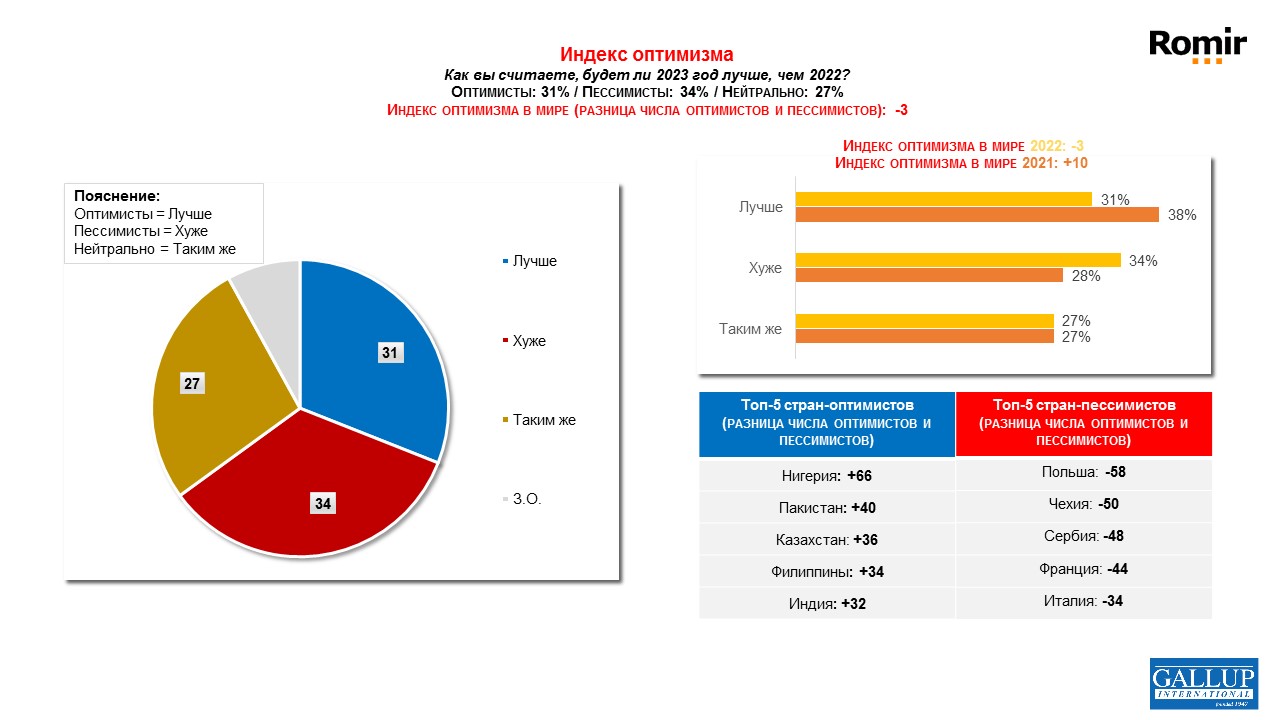 В мире каждый третий (31%) землянин считает, что 2023 год будет лучше, чем предыдущий. Треть респондентов (34%) придерживаются противоположного мнения и 27% считают, что 2023 год будет таким же. В целом по сравнению с прошлым годом уровень оптимизма сократился с +10 до -3 пунктов. Общественные настроения повторяют картину конца 2008 года, который показал самый низкий индекс оптимизма в новом столетии.