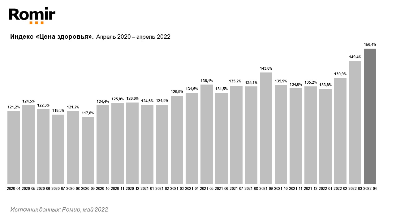 В апреле цены на лекарственные препараты выросли на 4,7% по сравнению с мартом. Индекс «Цена здоровья» составил 156,4%.