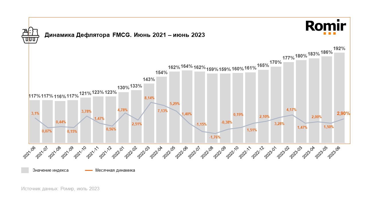 Исследовательский холдинг Ромир продолжает проводить расчеты статистического индекса-дефлятора, отражающего фактические изменения общего уровня цен на товары в категории FMCG.