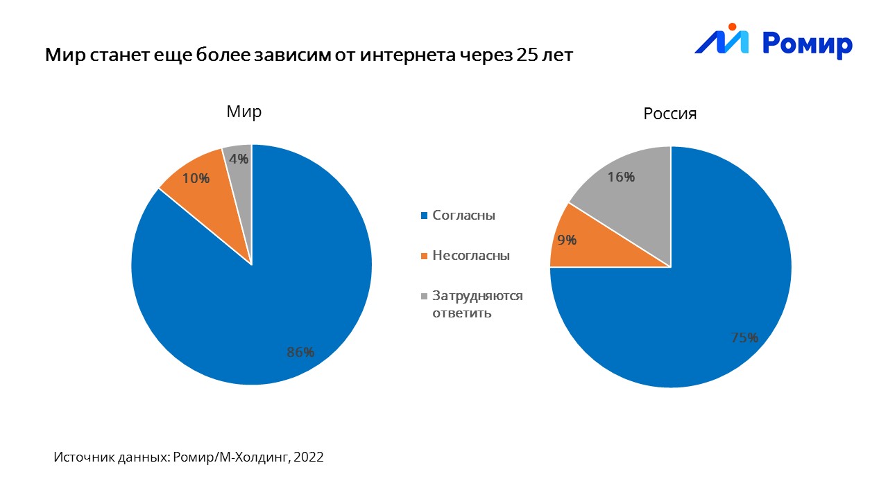В России 75% считают, что в будущем мир будет еще больше зависеть от интернета. При этом чаще всего об этом говорят представители старшего поколения (60 лет и старше).