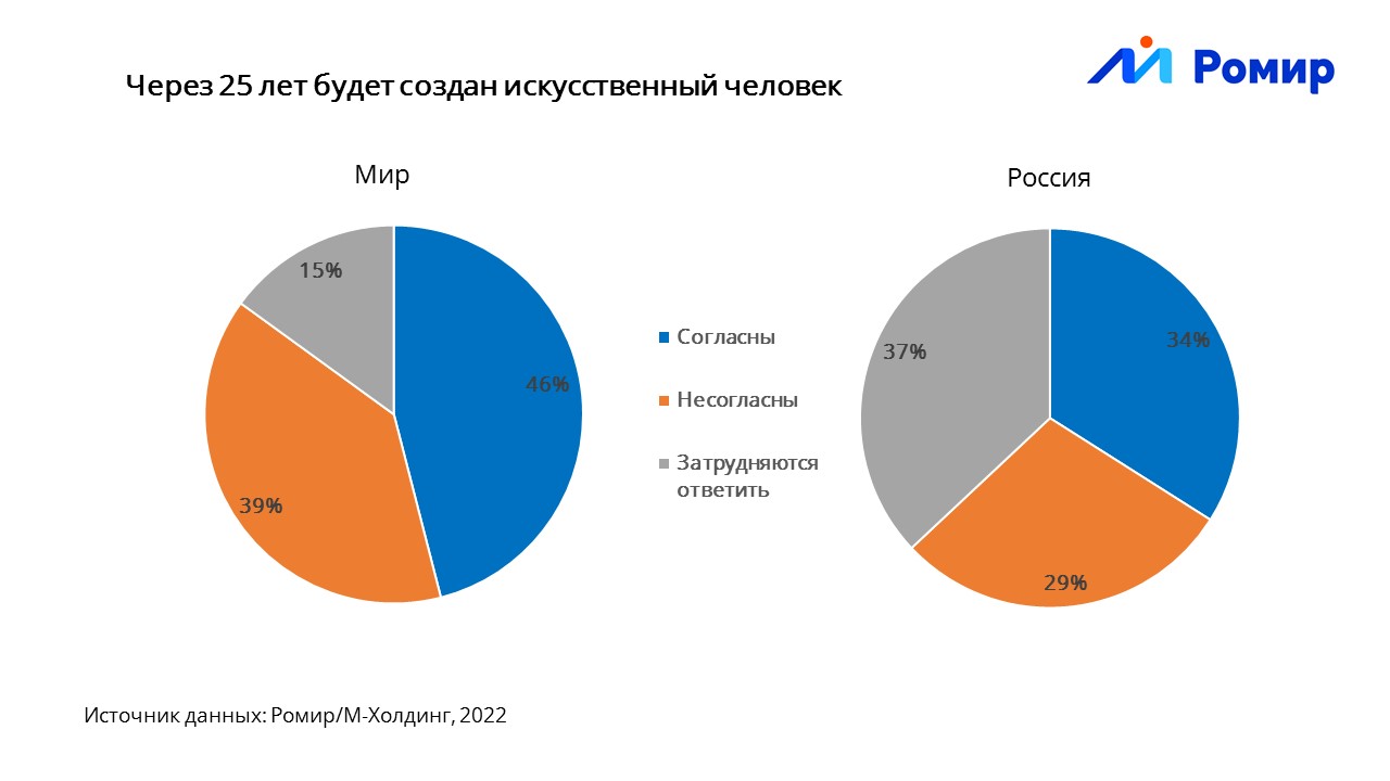 Исследовательская компания «Ромир» (входит в «М-Холдинг») совместно с Ассоциацией Gallup International (GIA) изучила мнение жителей Земли относительно того, что ждет нас через четверть века. По результатам глобального исследования почти каждый второй житель Земли уверен, что искусственный человек станет реальностью в ближайшие 25 лет.