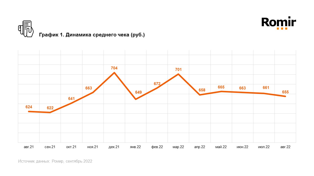 Индекс среднего чека россиянина в августе сократился на 1,0% (6 рублей) по сравнению с предшествующим месяцем и составил 655 рублей. В годовой динамике индекс вырос на 4,9% (31 рубль).